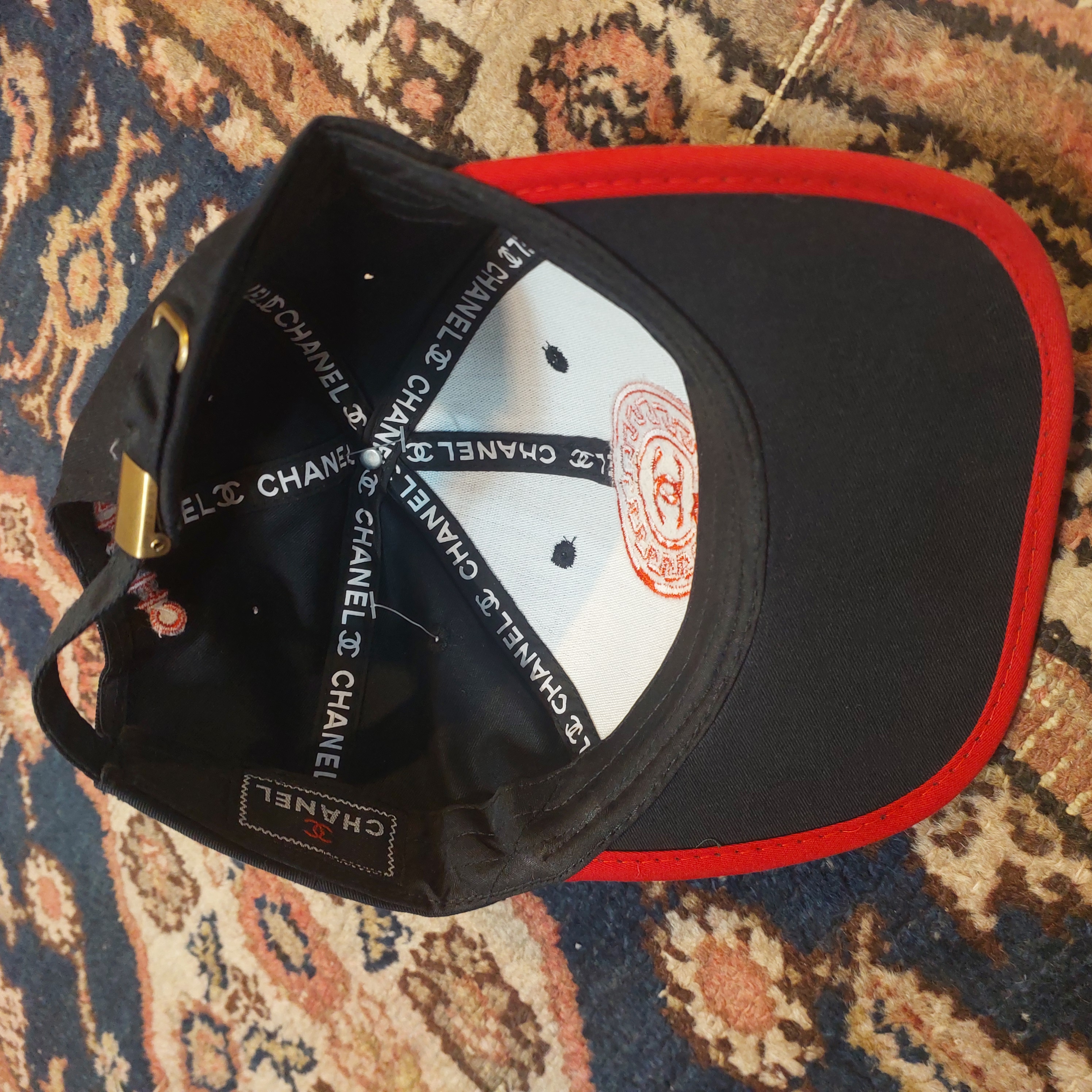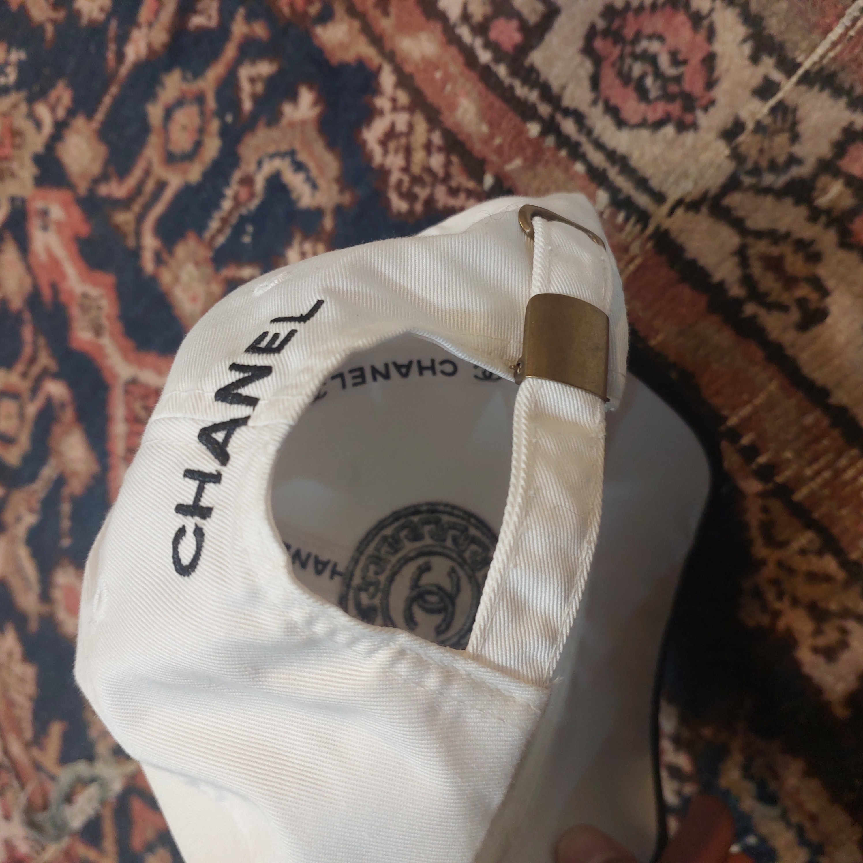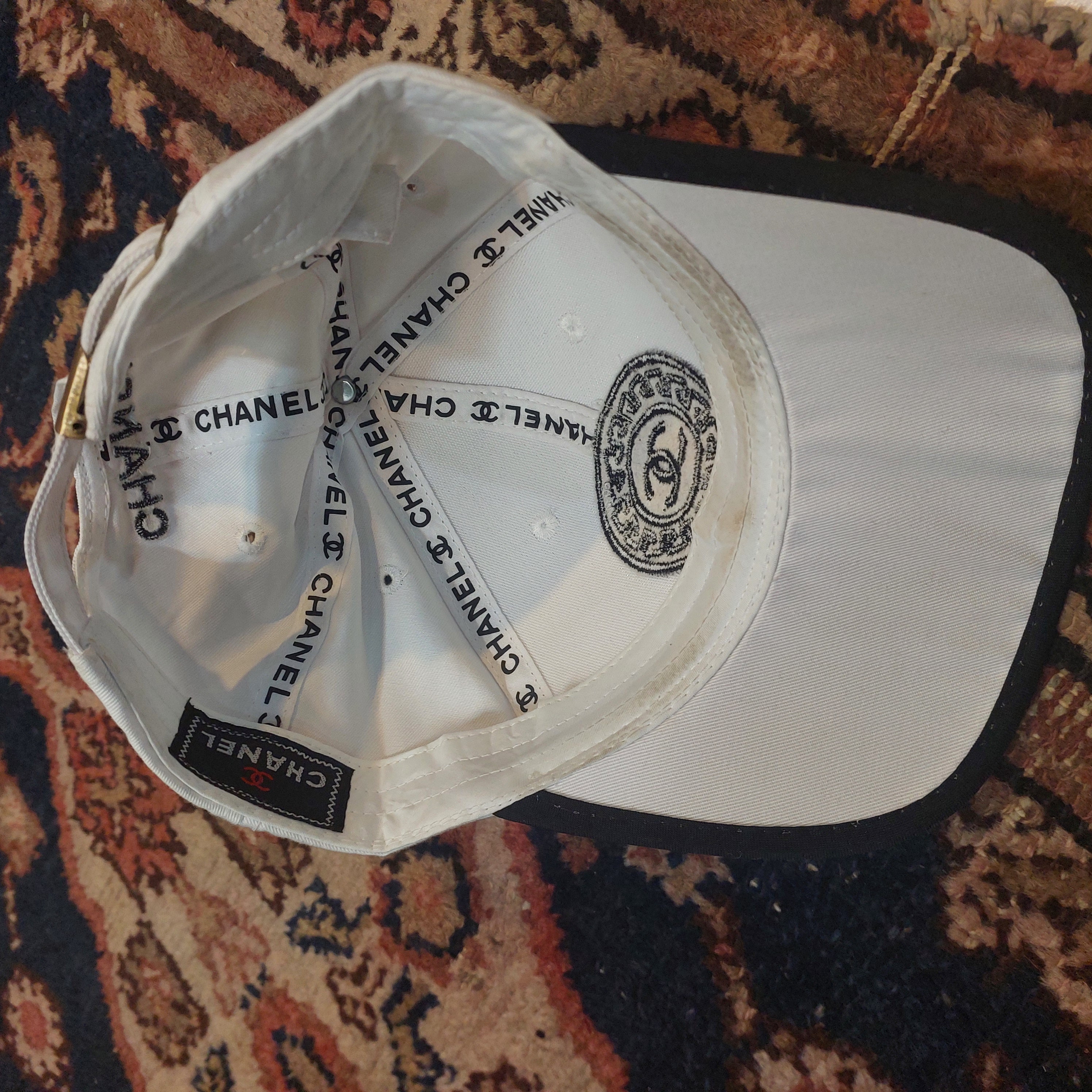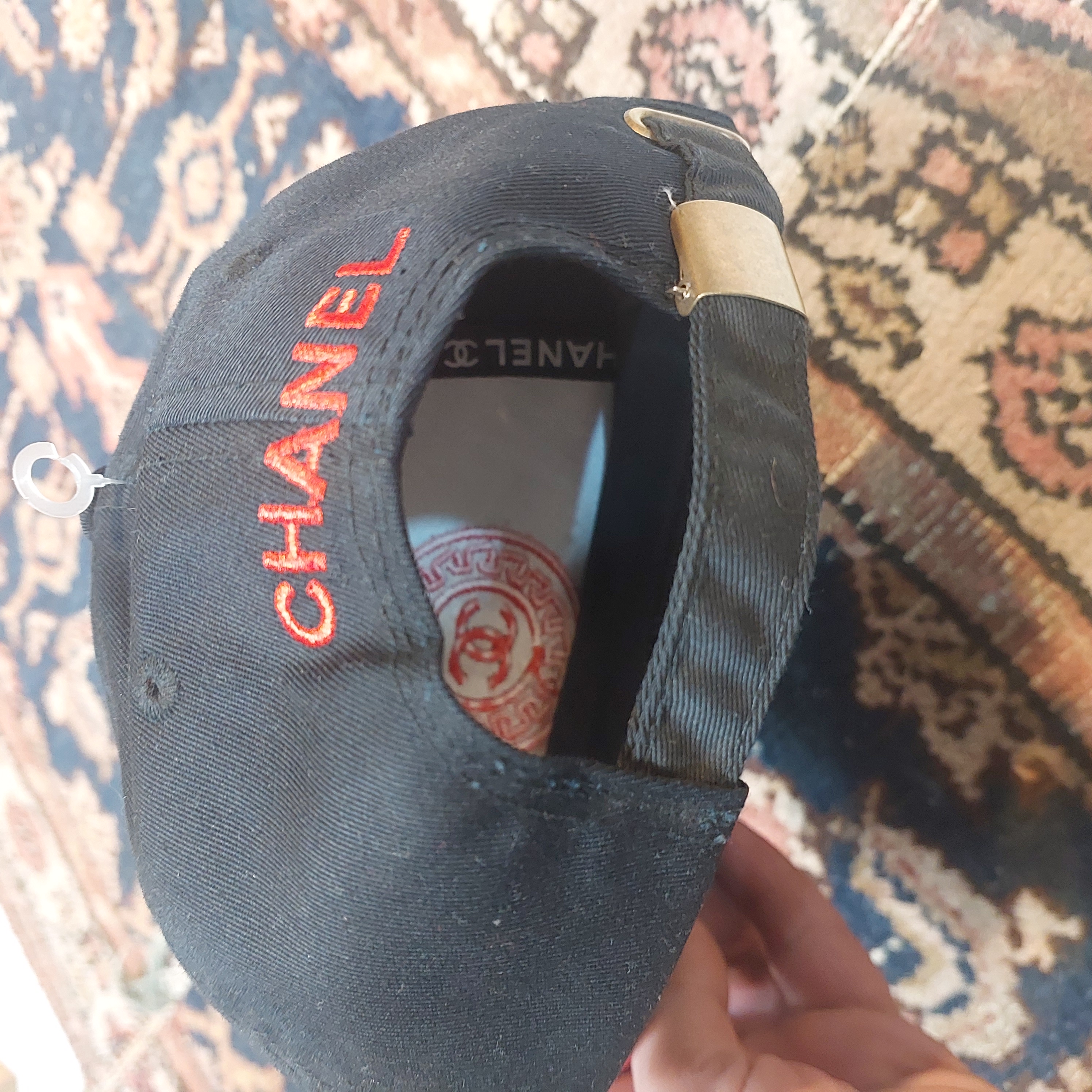 جزئیات پشت کلاه: عبارت CHANEL با دوخت باکیفیت در قسمت بالای دهانه پشت کلاه حک شده است.