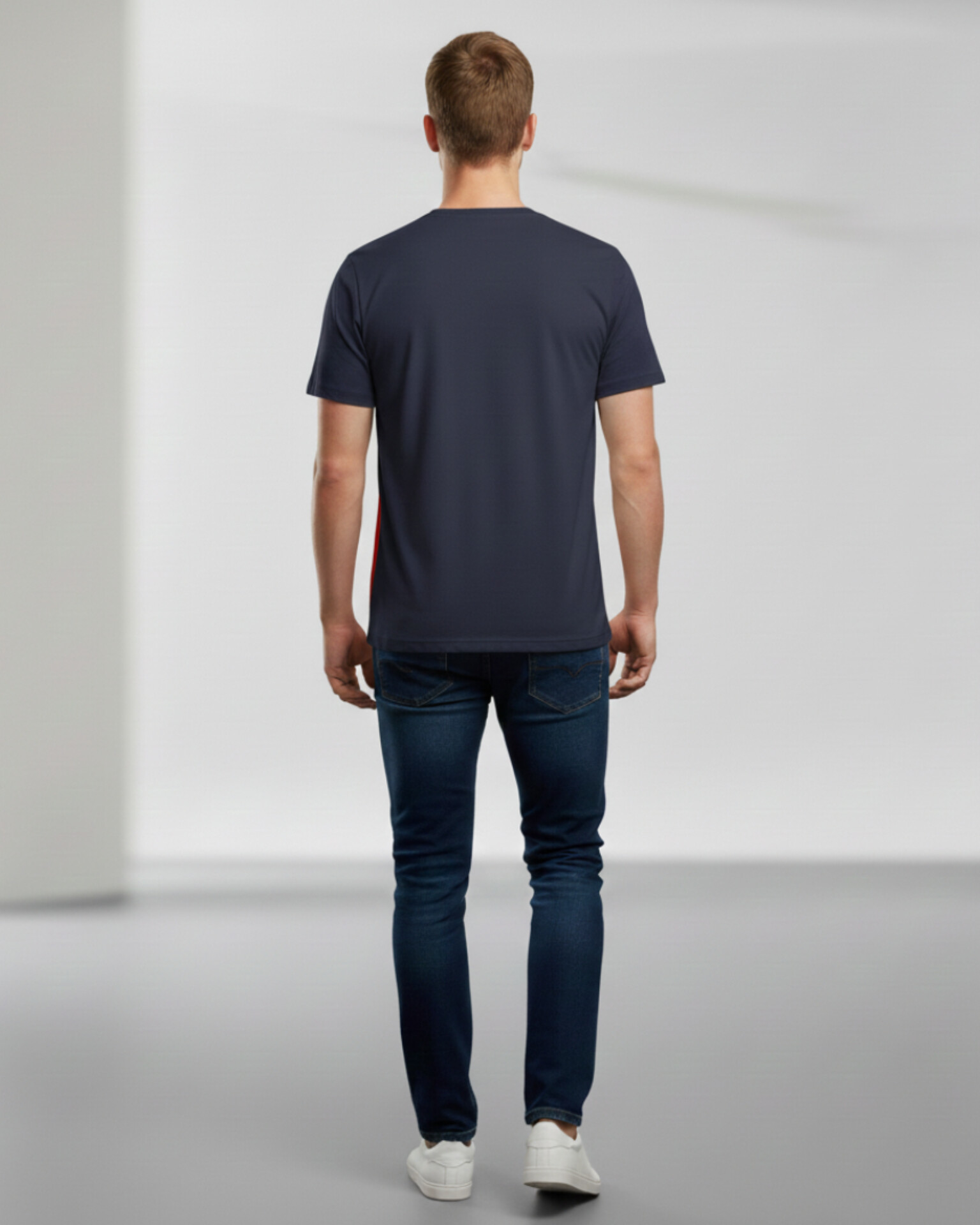 طراحی پشت تیشرت: تکرنگ آبی سرمهای (Navy Blue) برای ایجاد تضاد جذاب