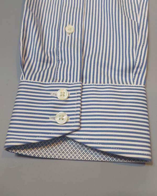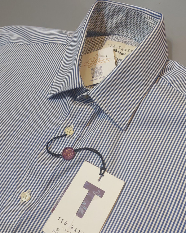 این پیراهن از کالکشن محبوب Endurance برند انگلیسی تدی بیکر (Ted Baker London) است که به دوام بالا و استایل کلاسیک و همیشگیاش شناخته میشود. طراحی این مدل با بافت راهراه عمودی بسیار ظریف به رنگ سرمهای (Navy) بر روی زمینه سفید، ترکیبی ایدهآل برای استایلهای رسمی و بیزنس-کژوال ایجاد کرده است.