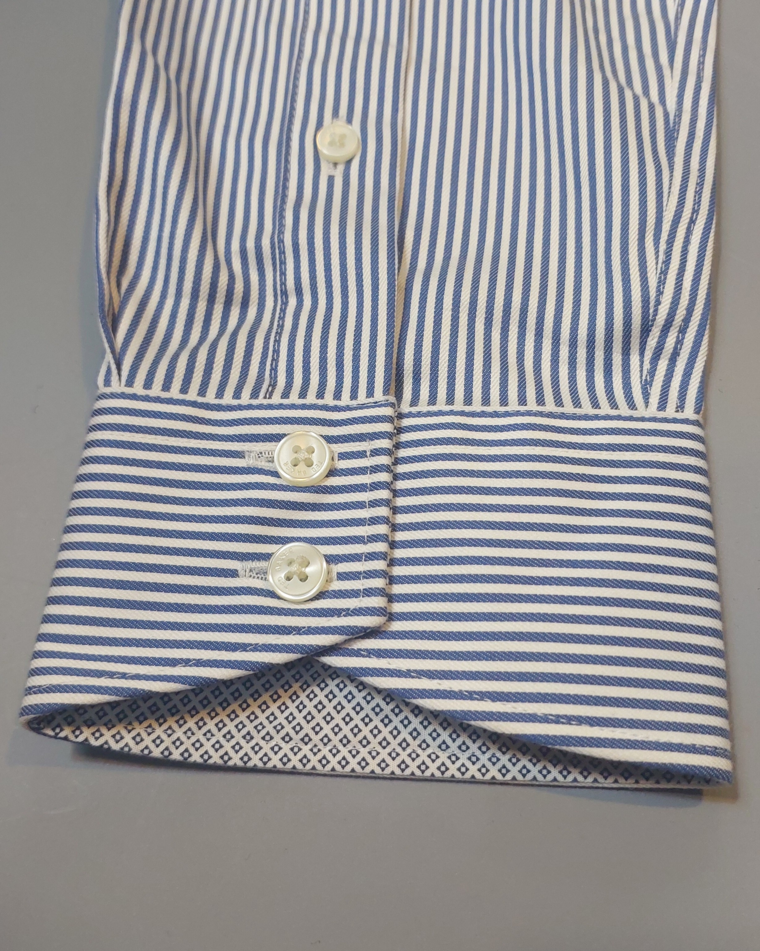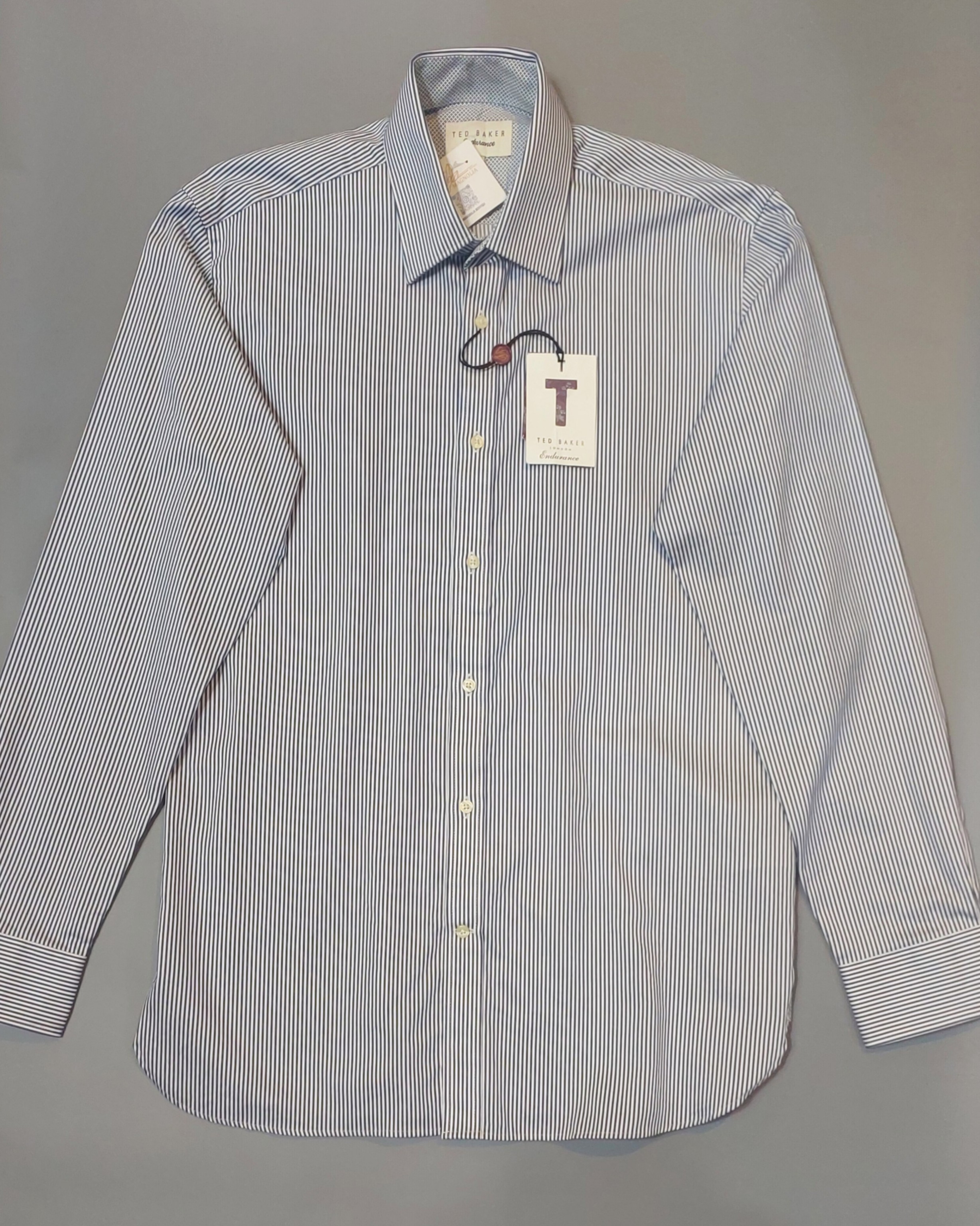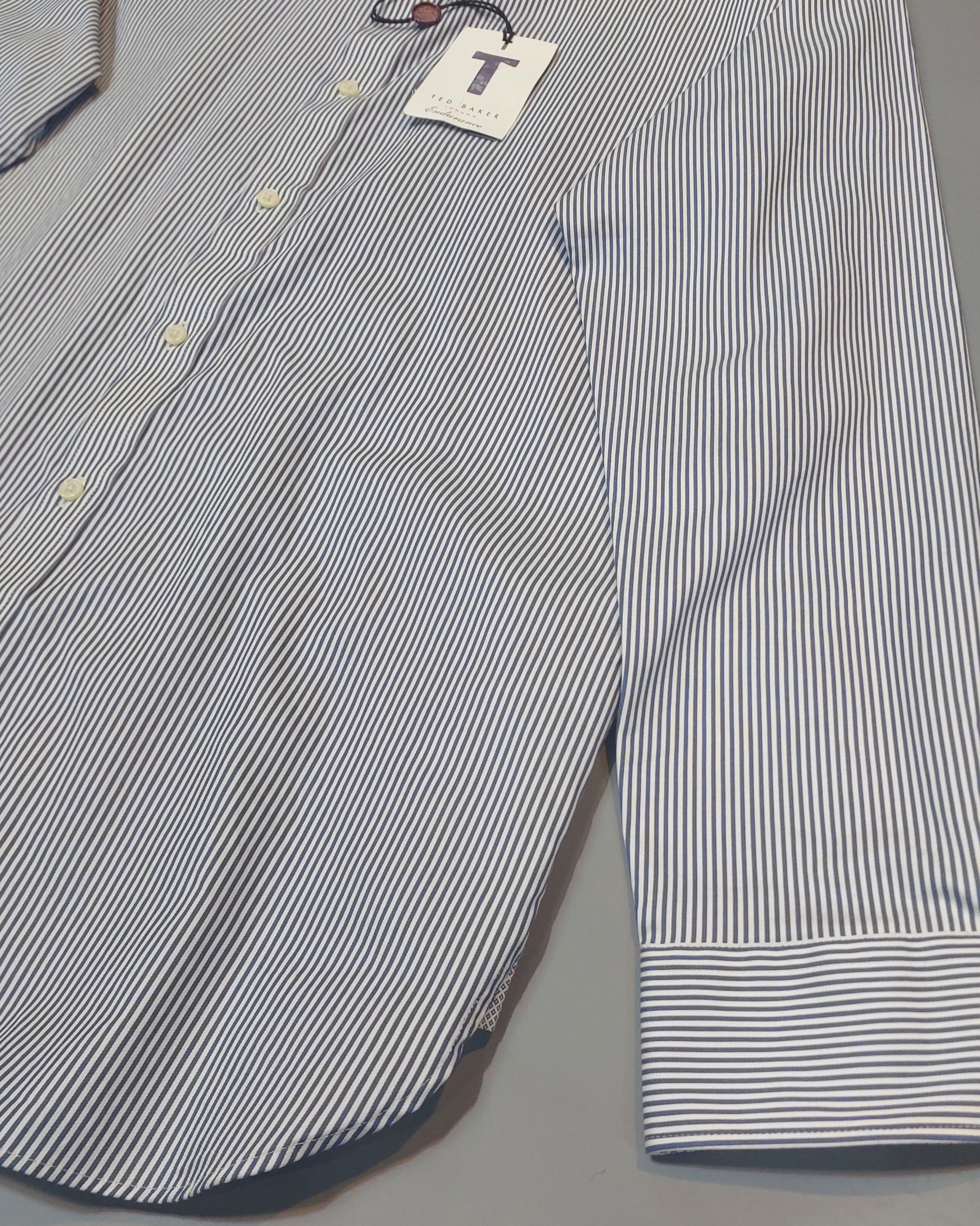 این پیراهن از کالکشن محبوب Endurance برند انگلیسی تدی بیکر (Ted Baker London) است که به دوام بالا و استایل کلاسیک و همیشگیاش شناخته میشود. طراحی این مدل با بافت راهراه عمودی بسیار ظریف به رنگ سرمهای (Navy) بر روی زمینه سفید، ترکیبی ایدهآل برای استایلهای رسمی و بیزنس-کژوال ایجاد کرده است.
