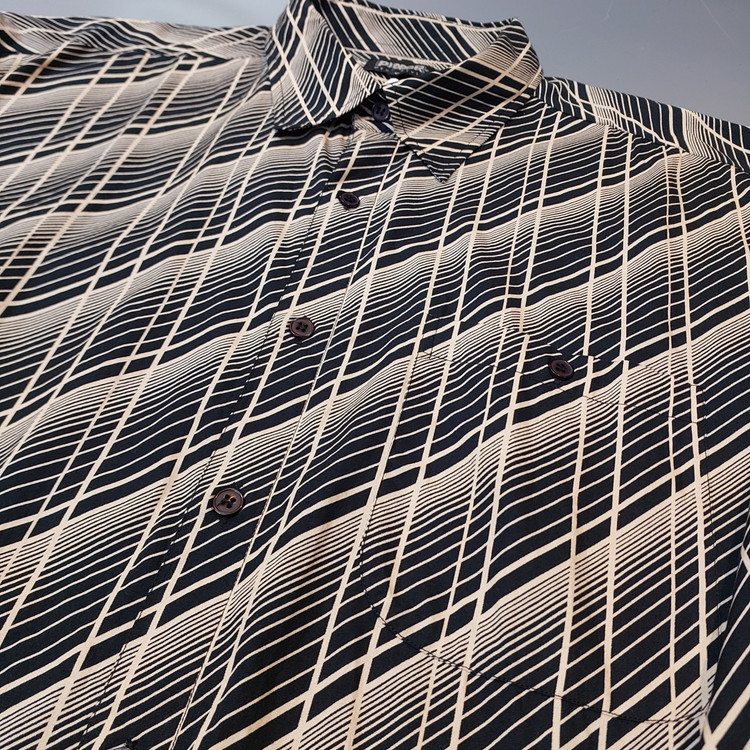 طراحی منحصربهفرد: دارای طرح هندسی با خطوط مورب کرمرنگ روی زمینه سرمهای/مشکی که جلوهای بصری و مدرن به پیراهن بخشیده است.