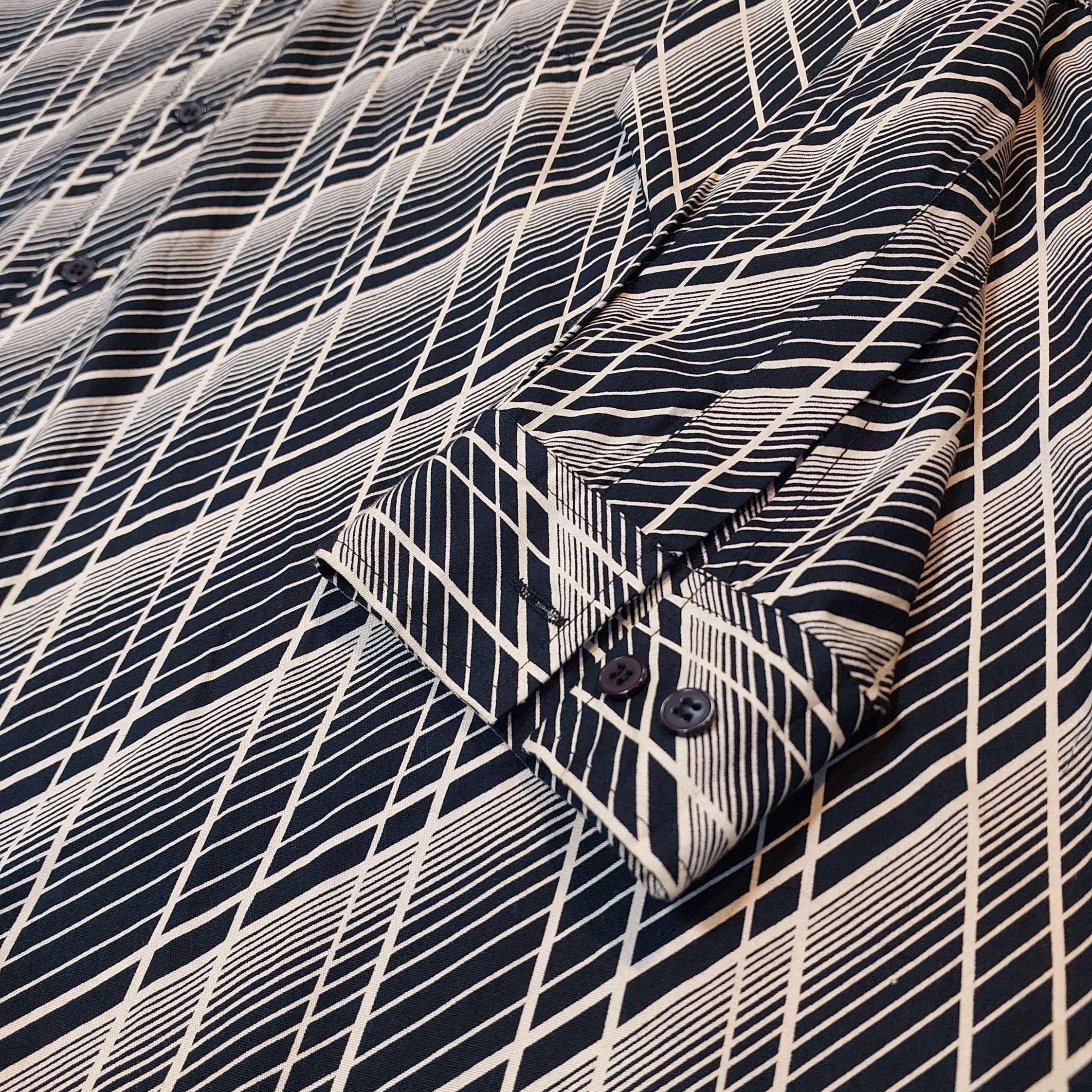 طراحی منحصربهفرد: دارای طرح هندسی با خطوط مورب کرمرنگ روی زمینه سرمهای/مشکی که جلوهای بصری و مدرن به پیراهن بخشیده است.