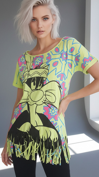این تیشرت با رنگ سبز فسفری (Neon Green) و طراحی منحصربهفرد، گزینهای ایدهآل برای استایلهای کژوال، فانتزی و خاصپسند است. ترکیب رنگهای شاد با المانهای نوستالژیک لونی تونز، ظاهری جسورانه به این کار بخشیده است.