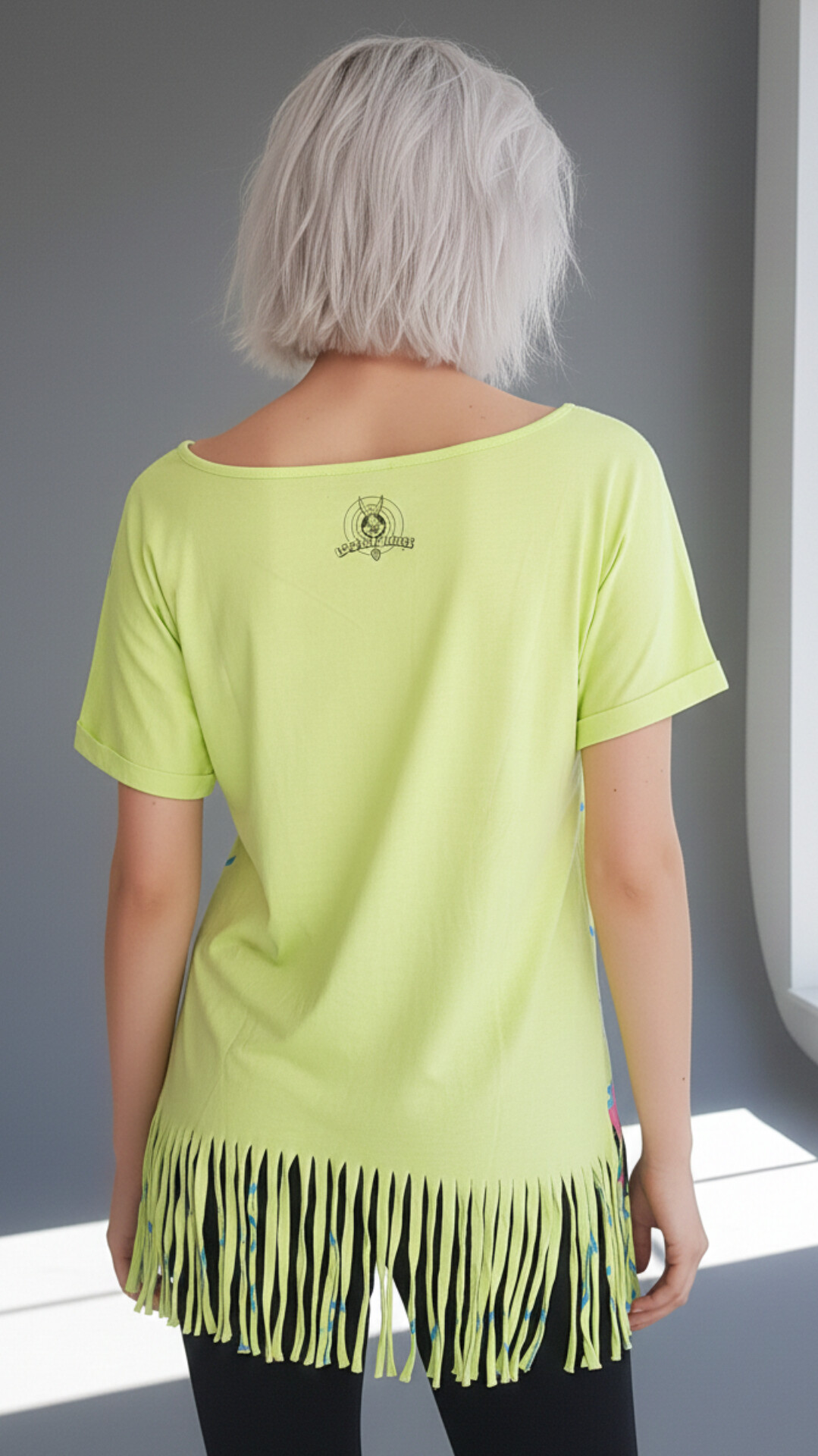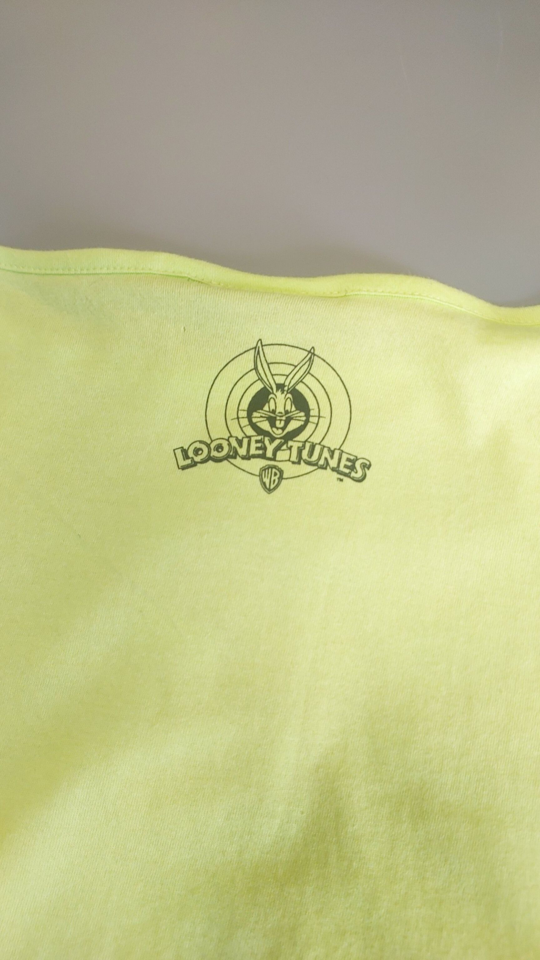 پشت تیشرت: نمای پشت کاملاً ساده و به رنگ سبز فسفری بوده و تنها لوگوی کلاسیک Looney Tunes (بنیخرگوش) در قسمت بالا، زیر یقه چاپ شده است.