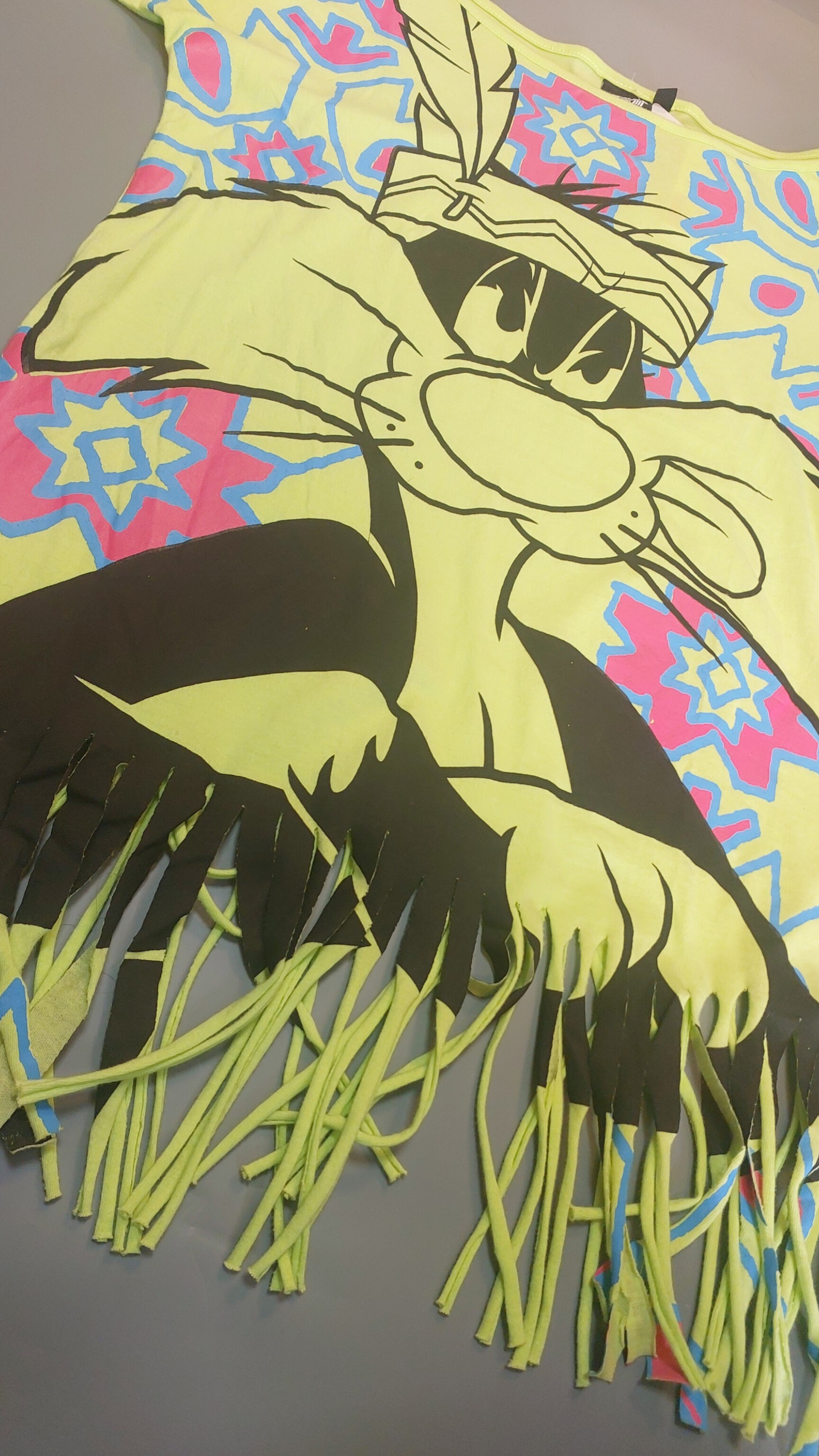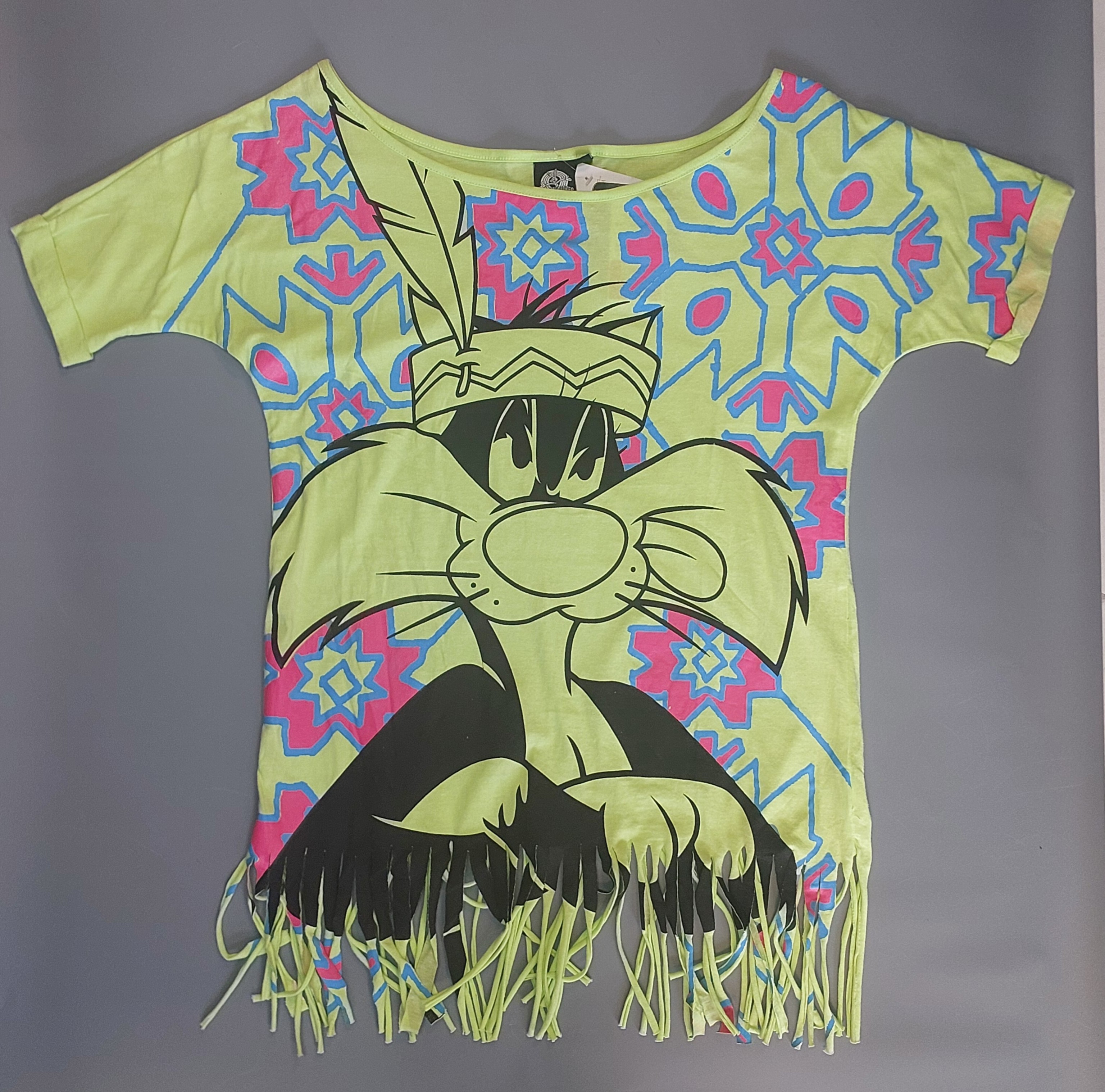 طرح روی کار: چاپ بزرگ کاراکتر سیلوستر (Sylvester) با کلاه سرخپوستی و پر، در زمینهای از الگوهای هندسی صورتی و آبی.