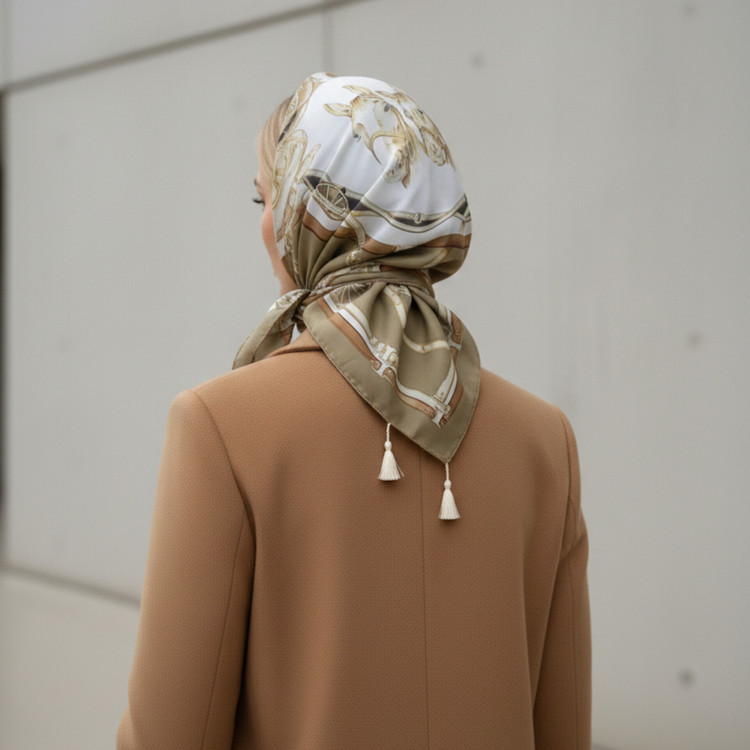این روسری بزرگ ۱۵۰ در ۱۸۰ سانتیمتر، تعریف جدیدی از ظرافت و کارایی است. طرح کلاسیک سوارکاری با الهام از نمادهای اشرافی، همراه با ترکیب رنگهای خنثی و گرم، این محصول را به یک اکسسوری همهکاره برای تمام فصلها تبدیل کرده است.