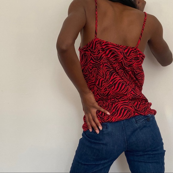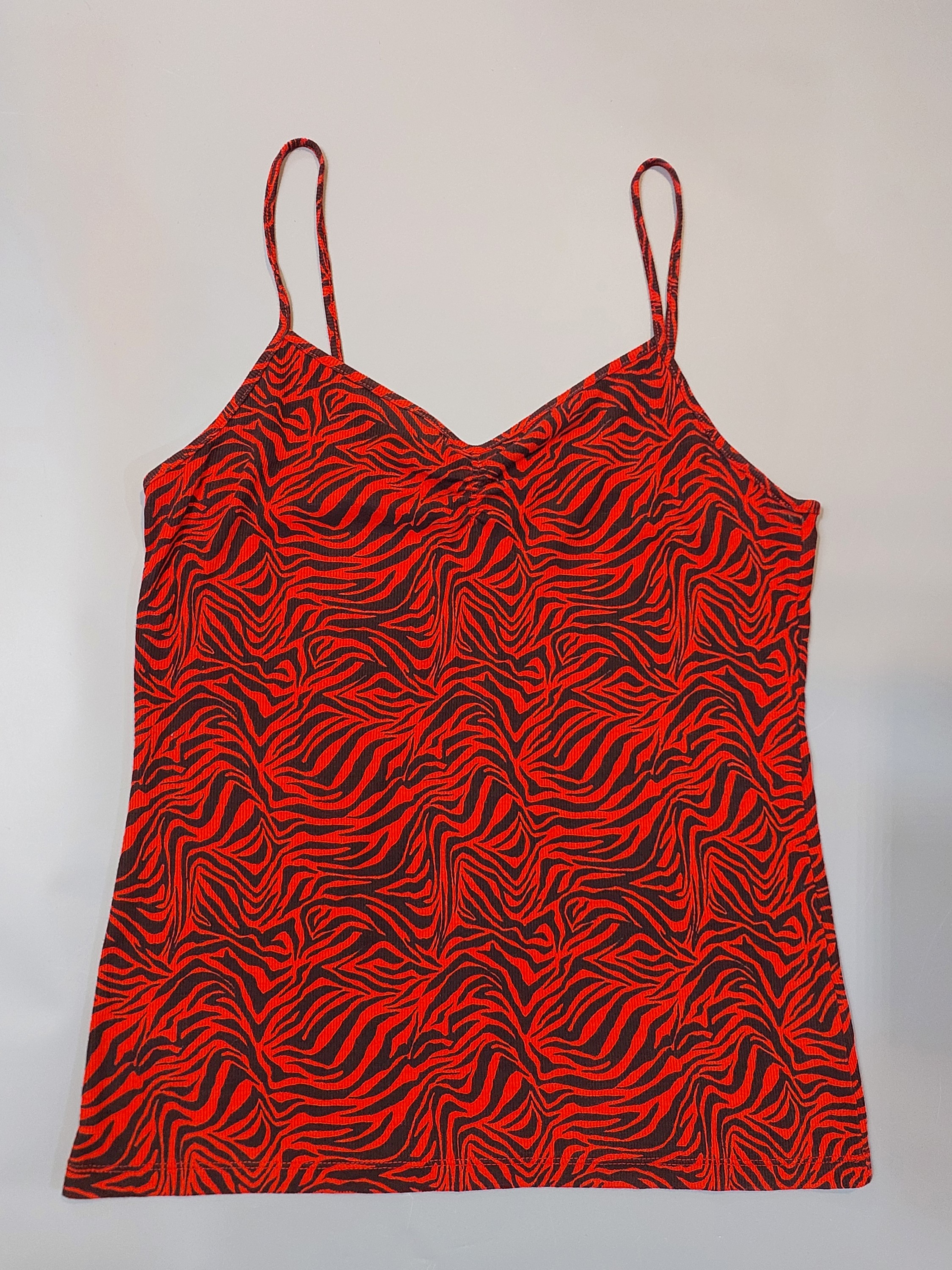 این تاپ جذاب و سبک، انتخابی عالی برای استایلهای کژوال، روزمره و مهمانیهای دوستانه در فصلهای گرم است. طرح زبرا (گورخری) قرمز و مشکی، ظاهری پرانرژی و جسورانه به شما میبخشد.